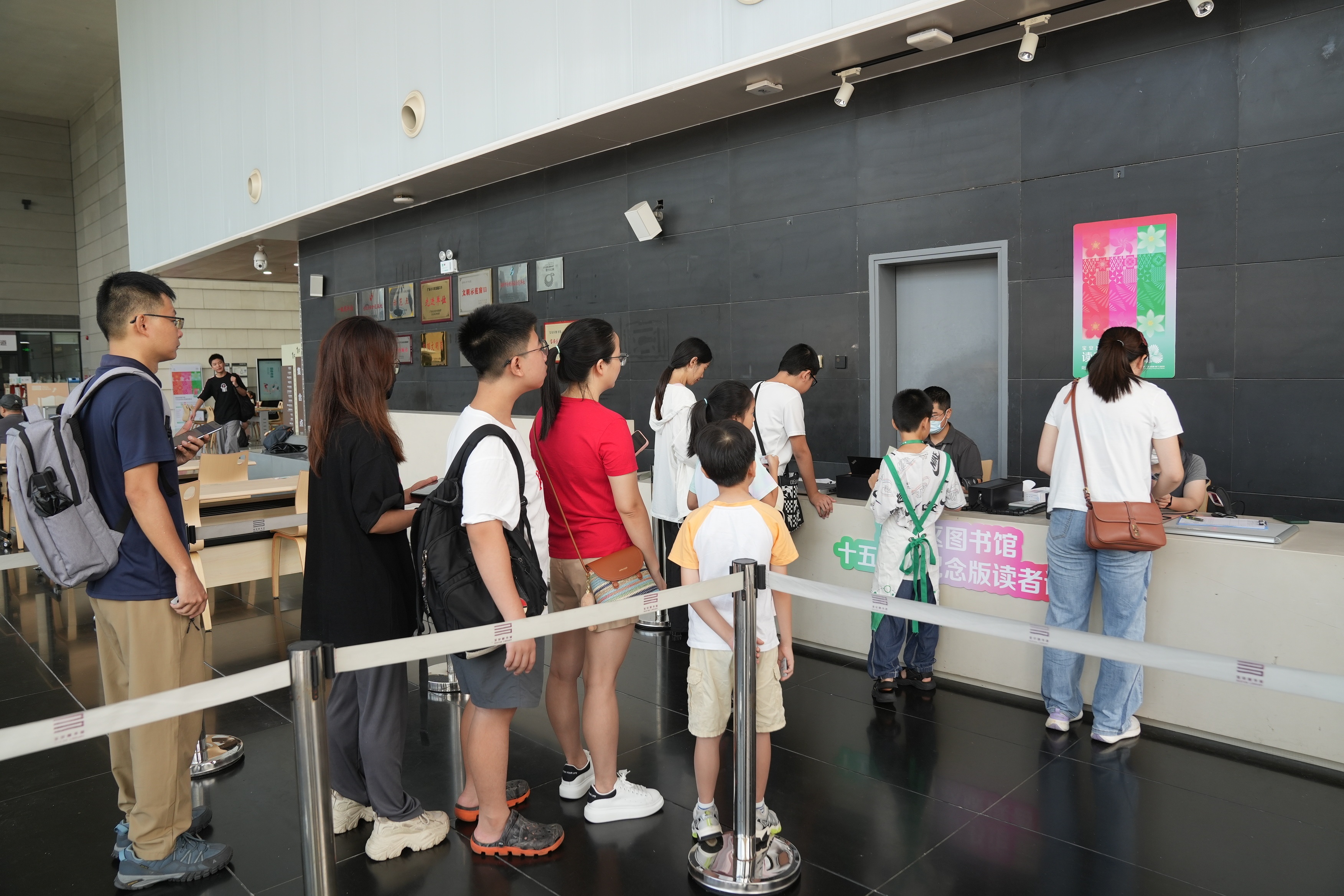8月9日上午,深圳市宝安区图书馆里排起了“长龙”——广东首张以十五运会为主题的纪念版读者证正式开放办理。据了解,这批纪念版读者证限量12000张,即日起在宝安区12家图书馆开放办理,办完即止。